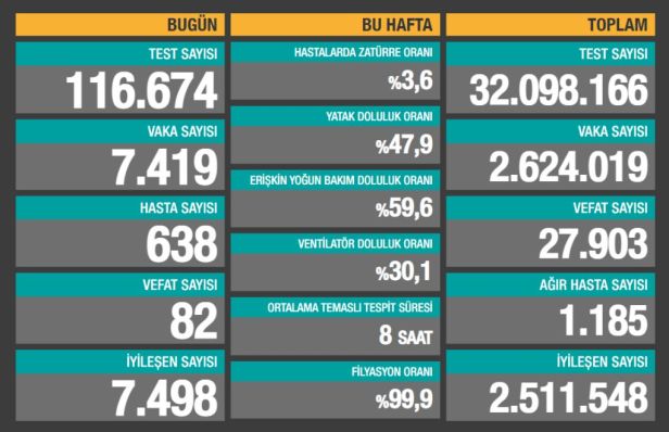 Buna göre Bakanlık, son 24 saatte 116.674 test yapıldığını, 7.419 kişiye Covid-19 tanısı konduğunu, bunlardan 638 kişinin Covid-19 hastası kabul edildiğini, 82 kişinin salgın nedeniyle hayatını kaybettiğini, 7.498 kişinin iyileştiğini, 1.185 Covid-19 hastasının durumunun ağır olduğunu açıkladı.