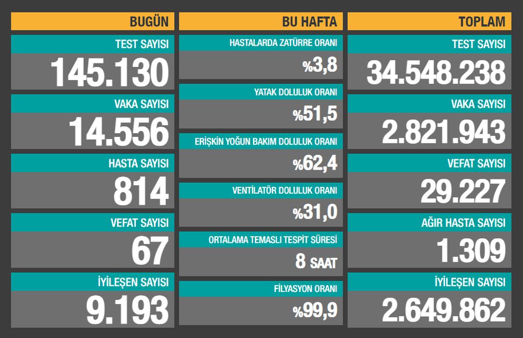 Sağlık Bakanlığı son 24 saatte 145.130 test yapıldığını, 14.556 kişiye Covid-19 tanısı konduğunu, 814 kişinin “hasta” kabul edildiğini, 67 kişinin de Covid-19 nedeniyle öldüğünü açıkladı.