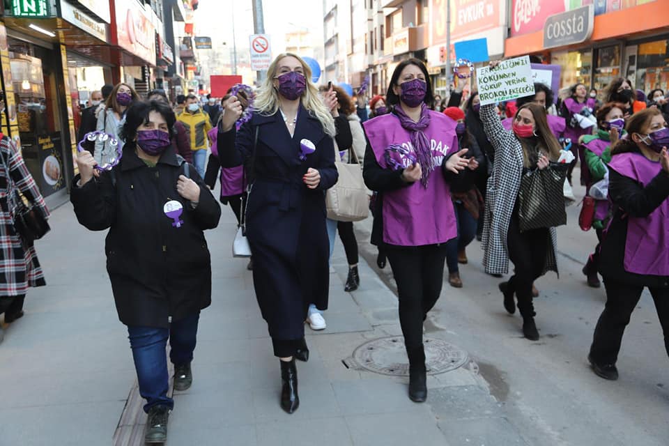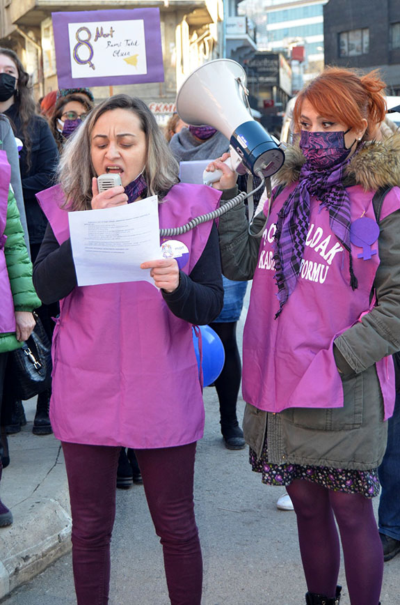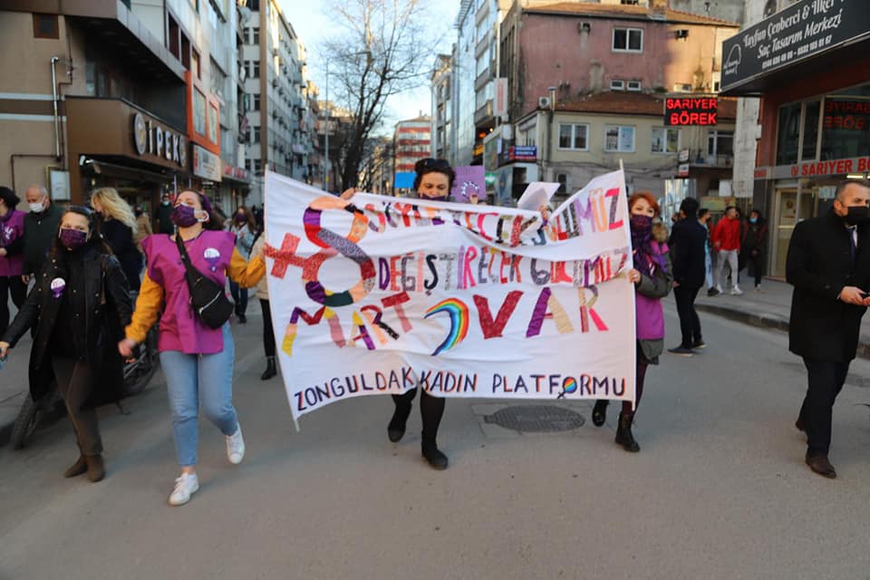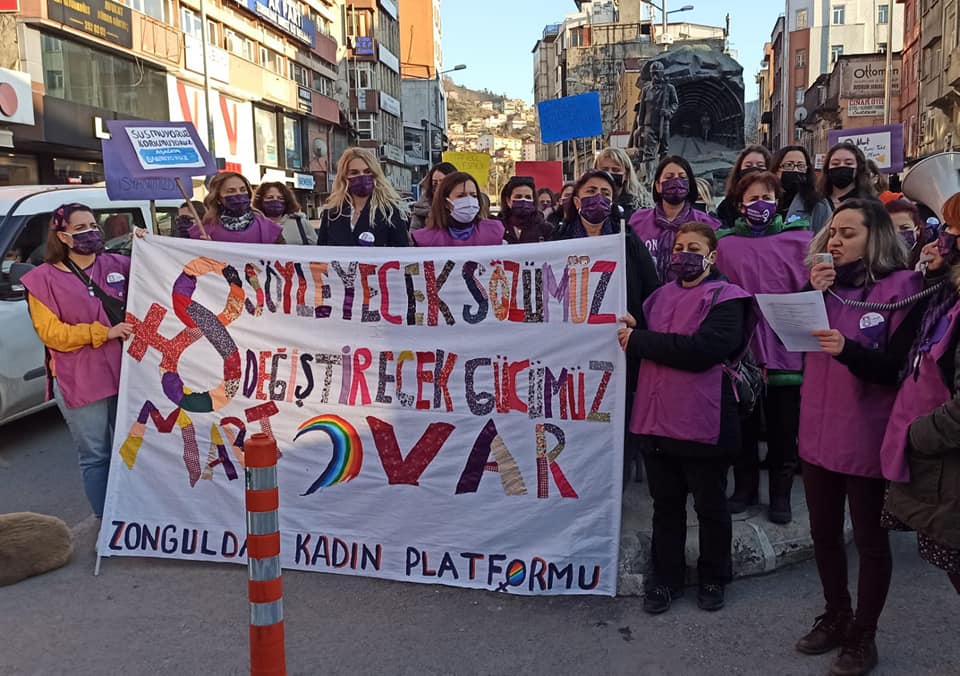 Madenci Anıtında düzenlenen eyleme, CHP Merkez İlçe Başkanı Ebru Uzun, İYİ Parti Merkez İlçe Başkanı Dilay Küçük, Atatürkçü Düşünce Derneği Başkanı Nazan Papila, CHP İl Kadın Kolları Başkanı Merve Kır, Kent Konseyi Kadın Meclisi Başkanı Nuray Gençalp, CHP İl Kadın Kolları üyeleri, KESK’e bağlı sendikaların kadın temsilcileri ile çok sayıda kadın katıldı.Basın açıklaması sonrası Gazipaşa Caddesinde yürüyüşe geçen topluluğa yer yer Polisin müdehalesi olsada kadınlar yürüyüş[1]lerine devam edererek Zonguldak Valiliğine kadar yürüdür.