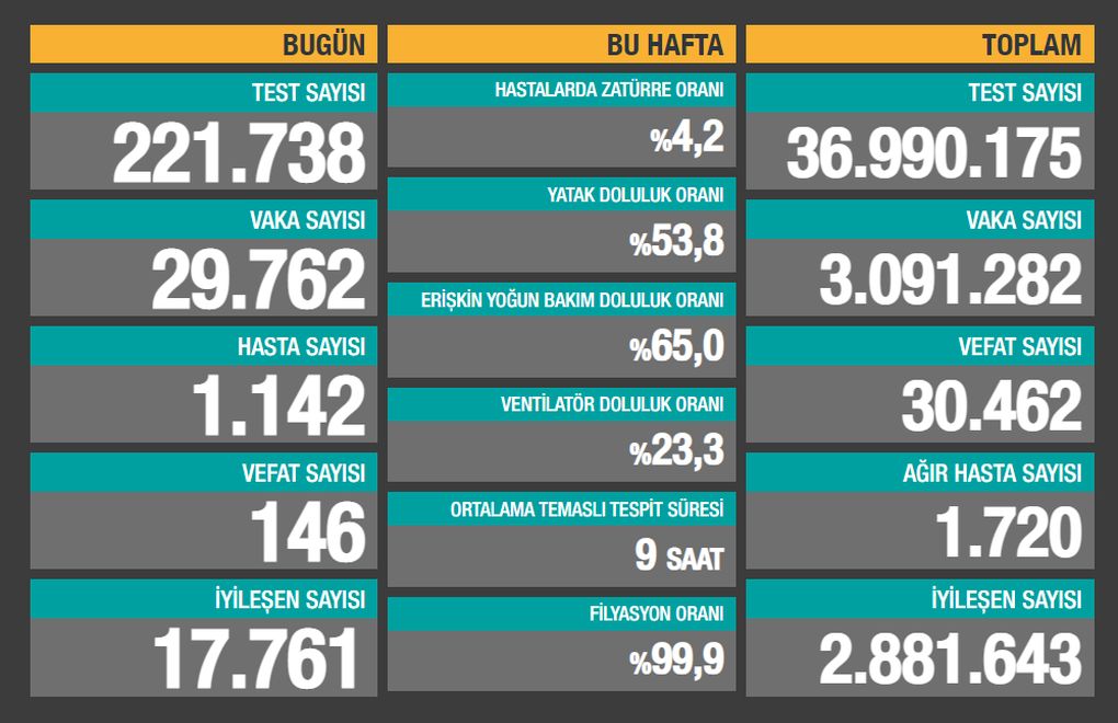 Bakanlığa göre, toplam Covid-19 vaka sayısı 3.091.282, ölen kişi sayısı 30.462. Toplam iyileşen sayısı ise 2.881.643.