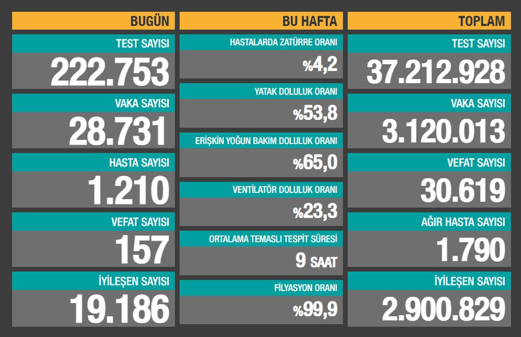 Sağlık Bakanlığı son 24 saatte 222.753 test yapıldığını, 28.731 kişiye Covid-19 tanısı konduğunu, 1.210 kişinin “hasta” kabul edildiğini, 157 kişinin de Covid-19 nedeniyle öldüğünü açıkladı.