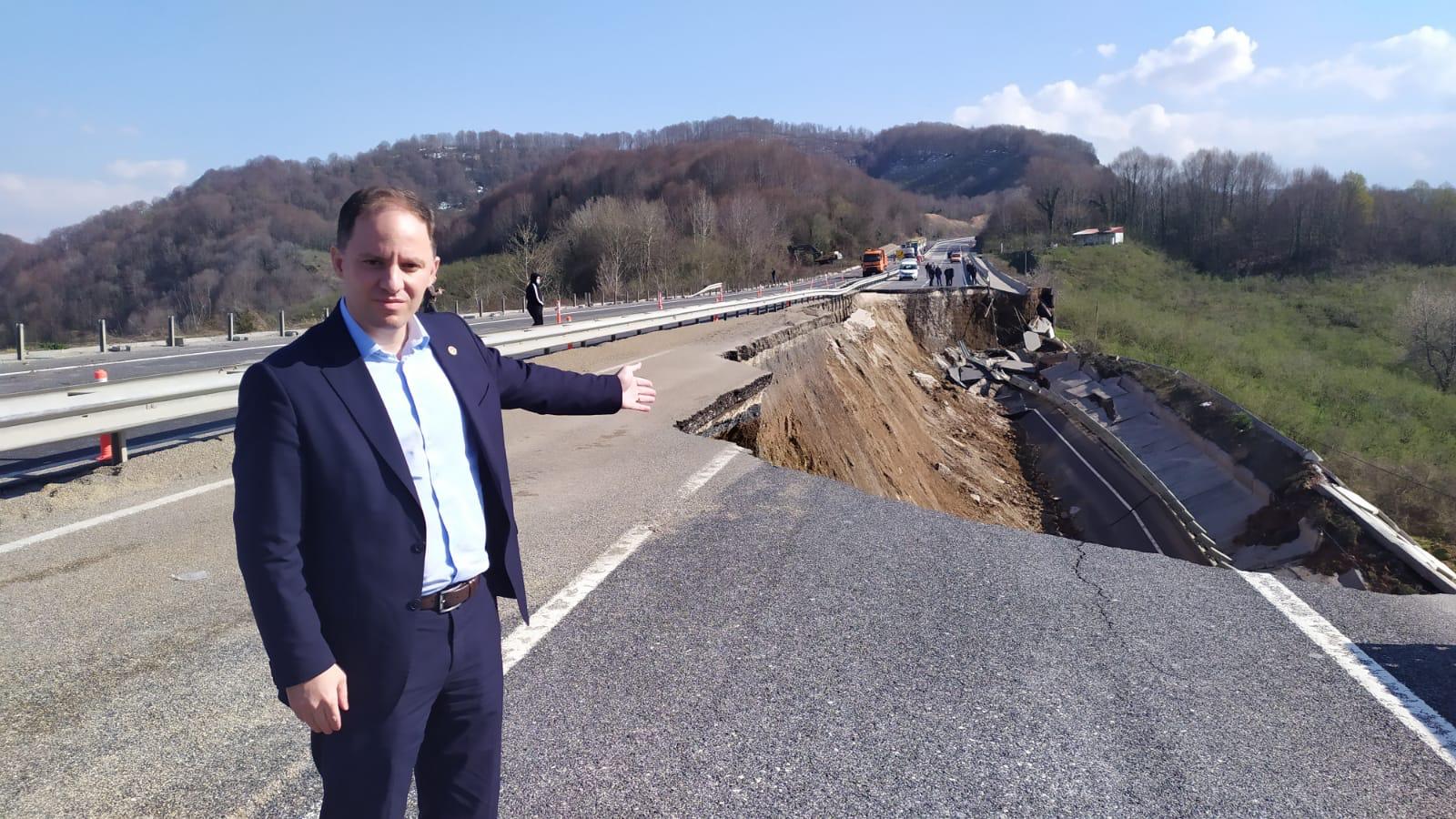 “Yolun dolguyla yapılması nedeniyle karayolu çökmüş vaziyette. Düzgün ve bilimsel zemin etüdünün yapılmadığının ispatı karşımızda duruyor. İnanılmaz bir görüntü, ucuz atlatılmış büyük bir felaket. Burada adeta bir meteor düşmüş gibi görüntü bir görüntü var.