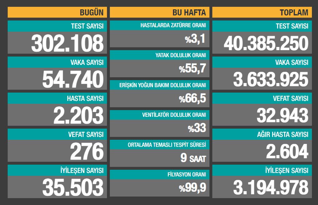 Sağlık Bakanlığı son 24 saatte 302.108 test yapıldığını, 54.740 kişiye Covid-19 tanısı konduğunu, 2.203 kişinin “hasta” kabul edildiğini, 276 kişinin de Covid-19 nedeniyle öldüğünü açıkladı.