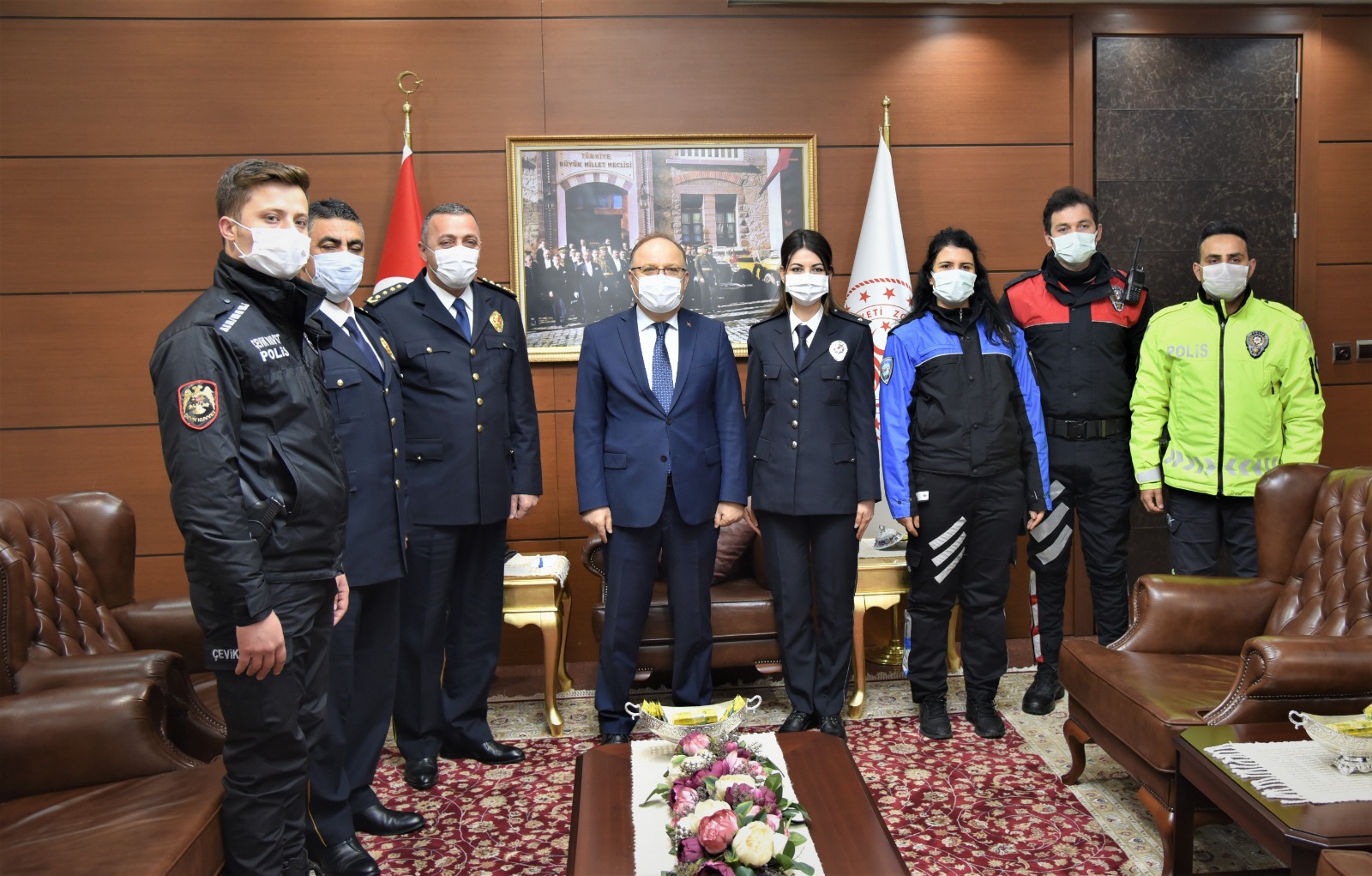Vali Tutulmaz ziyarette ‘’kurulduğu günden bu güne aziz milletimizin huzur ve güvenliği için görevlerini üstün vazife anlayışıyla gayret ve özveriyle yerine getiren polis teşkilatımızın kuruluşunun 176. Yılını ve polis haftasını kutluyor, görevlerinde kolaylıklar ve başarılar diliyorum’’ dedi.