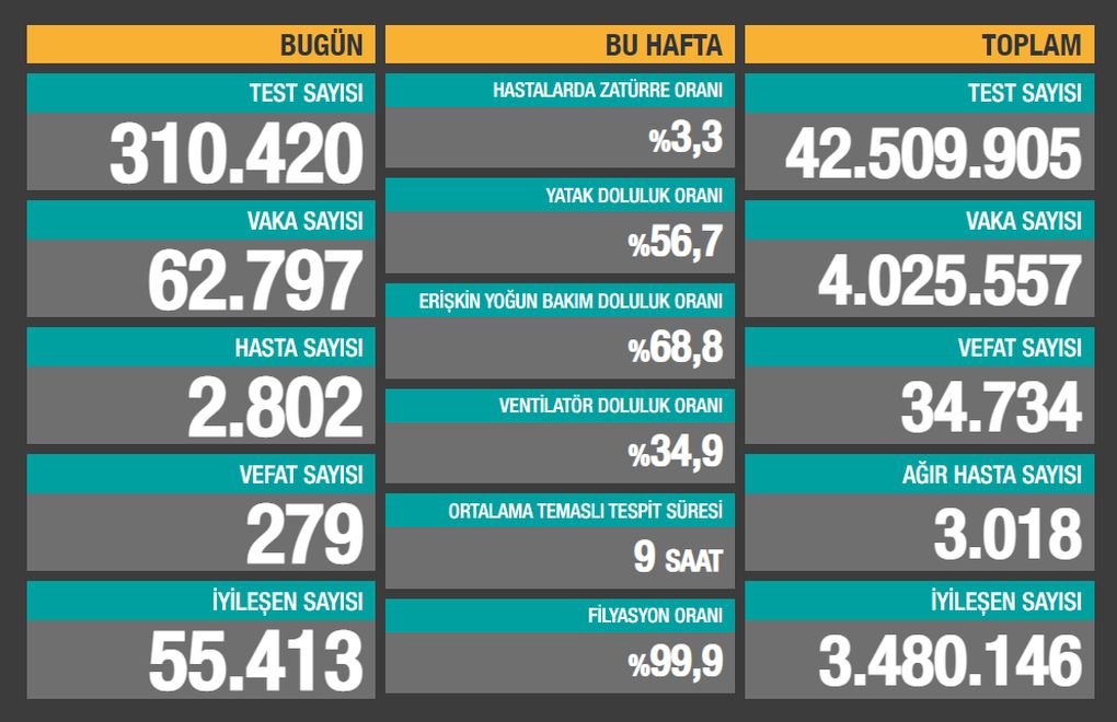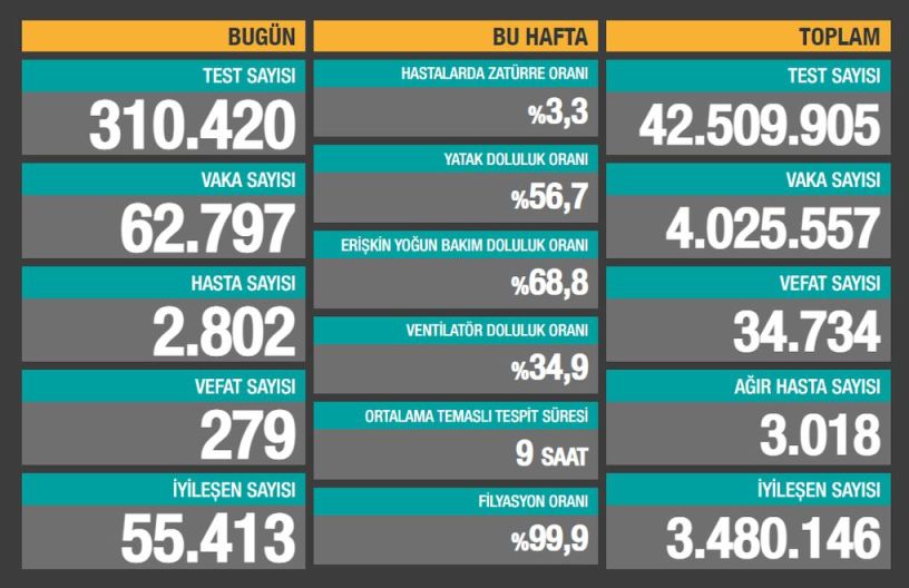 Sağlık Bakanlığı son 24 saatte 310.420 test yapıldığını, 62.797 kişiye Covid-19 tanısı konduğunu, 2.802 kişinin “hasta” kabul edildiğini, 279 kişinin de Covid-19 nedeniyle öldüğünü açıkladı.