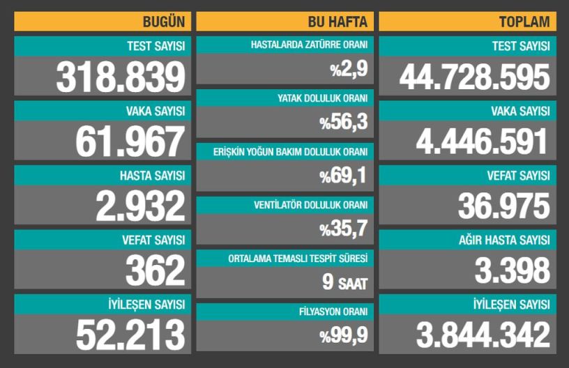 Sağlık Bakanlığı son 24 saatte 318.839 test yapıldığını, 61.967 kişiye Covid-19 tanısı konduğunu, 2.932 kişinin “hasta” kabul edildiğini, 362 kişinin de Covid-19 nedeniyle öldüğünü açıkladı.