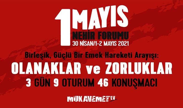30 Nisan 2021 Cuma günü saat 17:00’da başlayacak ve 2 Mayıs’da sona erecek olan 1 Mayıs Nehir Forumu Mukavemet TV Youtube kanalından ve Mukavemet.org sitesi sosyal medya hesaplarından aynı anda canlı olarak izlenebilecek. Üç gün sürecek programda, her gün üç oturum gerçekleştirilecek. Toplam 46 katılımcının yer aldığı, “Birleşik, Güçlü bir Emek Hareketi Arayışı: Olanaklar ve Zorluklar” başlığı ile açıklanan forumun ilk günü, açılış konuşmasını “Öyle mi Alay Komutanı” sözleriyle emek mücadelesinde yankı uyandıran Mukavemet bileşenlerinden Kamil Kartal yapacak.