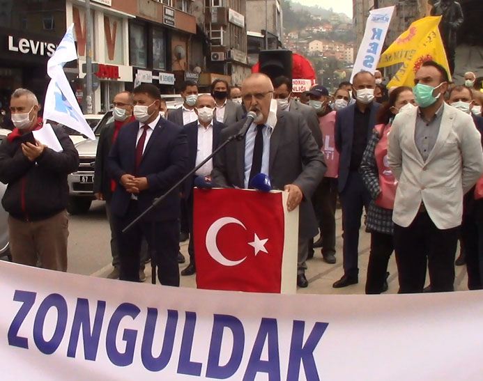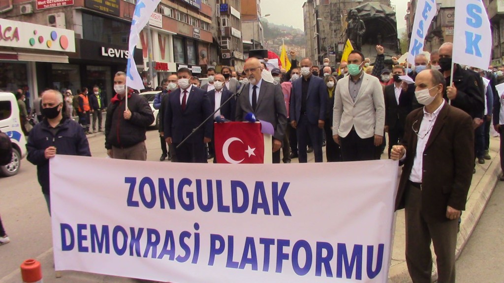 Açılış konuşmasını Demokrasi Platformu adına TMMOB Maden Mühendisleri Odası Zonguldak Şube Başkanı Çağlar Öztürk yaptı. Öztürk konuşmasında; “Bugün dünya genelinde ve ülkemizde artan salgın ve buna paralel giderek büyüyen ekonomik kriz milyonlarca emekçiyi ve halkımızın büyük kısmını yoksulluk, geleceksizlik umutsuzluk girdabına sokmuş durumdadır. Diğer yandan siyasi iktidar tüm hak arama yöntemlerini baskı ve zorbalıkla ezen sermaye düzenini kollamak, korumak ve düzenin sahiplerinin servetini koruma, büyütme derdindedir.