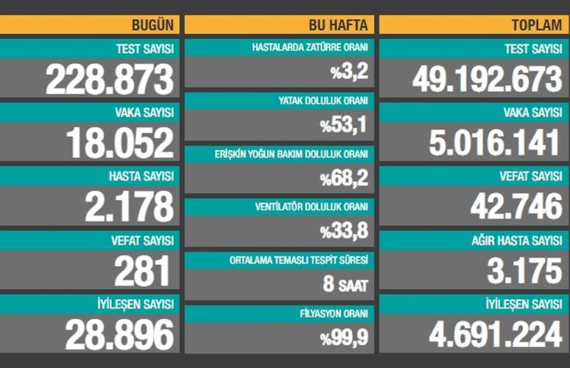 Sağlık Bakanlığı son 24 saatte 228.873 test yapıldığını, 18.052 kişiye Covid-19 tanısı konduğunu, 2.178 kişinin “hasta” kabul edildiğini, 281 kişinin de Covid-19 nedeniyle öldüğünü açıkladı.