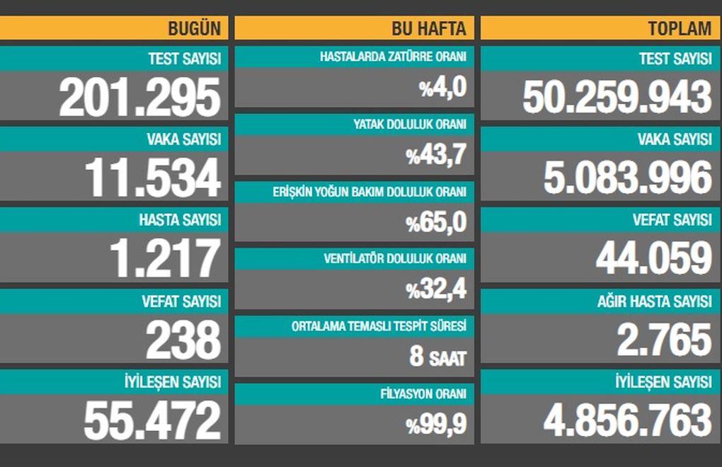 Bakanlığın açıklamasına göre, son 24 saatte 201.295 test yapıldığını, 11.534 kişiye Covid-19 tanısı konduğunu, bunlardan 1.217 kişinin Covid-19 hastası kabul edildiğini, 238 kişinin salgın nedeniyle hayatını kaybettiğini, 55.472 kişinin iyileştiğini, 2.765 Covid-19 hastasının durumunun ağır olduğunu açıkladı.