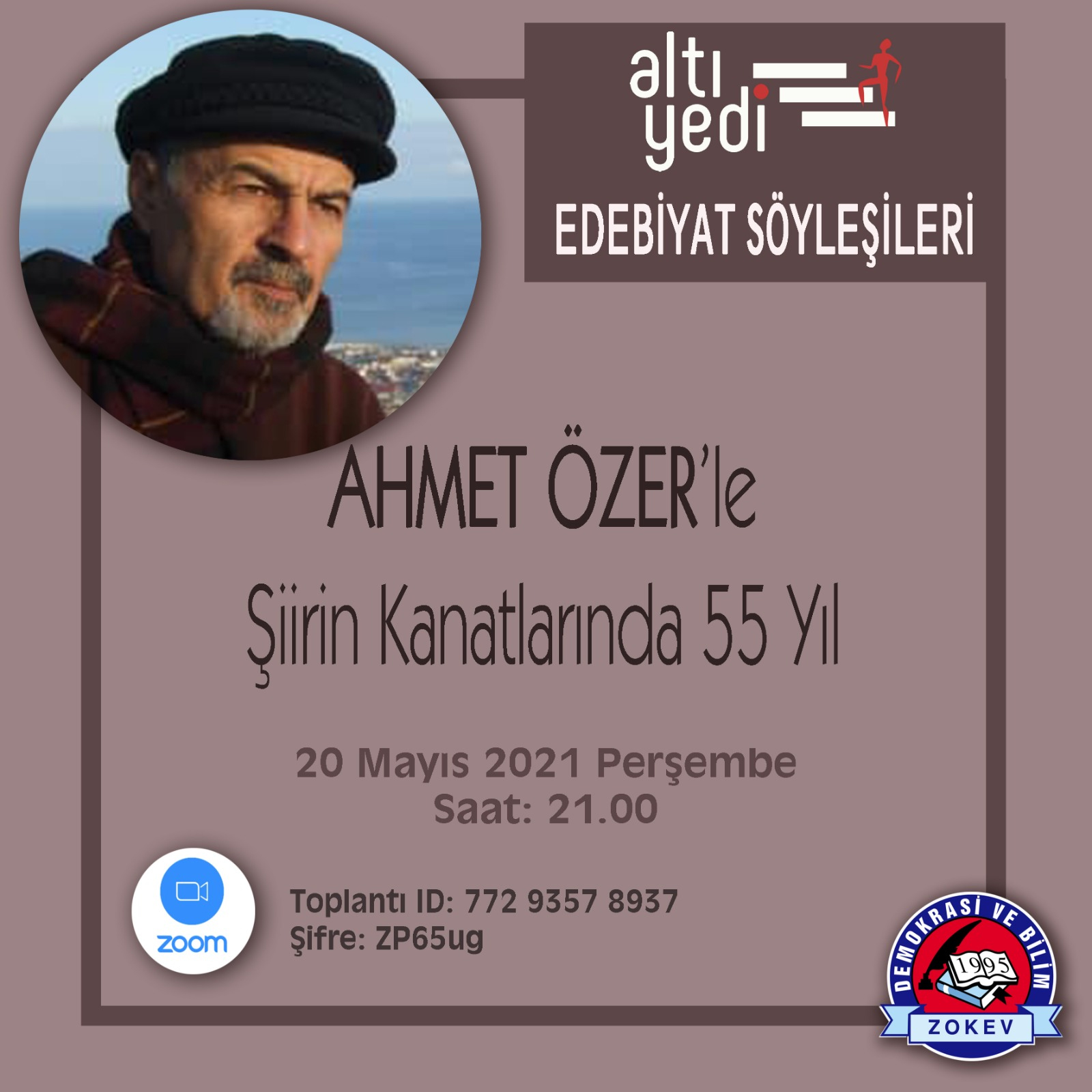 Türk şiirinin önemli isimlerinden Ahmet Özer, Altıyedi dergisi Edebiyat Söyleşileri’de. “Şiirin Kanatlarında 55 Yıl” başlıklı söyleşi, 20 Mayıs Perşembe akşamı 21.00’de zoom programı üzerinden çevrimiçi gerçekleşecek (Meeting ID: 772 9357 8937 Passcode: ZP65ug). Şairin poetik dünyasını etkileyen anılarından, şair ve edebiyatçı kişiliğinden, edebiyata ve sanata bakışından, yayıncı ve editör olarak verimlerinden ve Klaros Yayınları arasından çıkan son kitabı Mordoğan’dan bahsetmesi beklenen söyleşi ilgilisine açık.