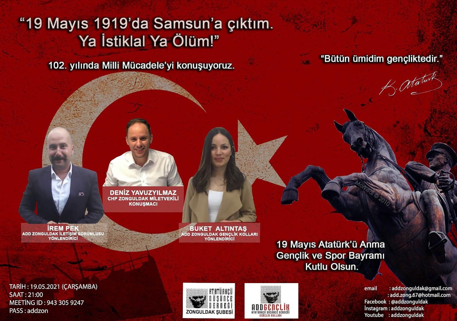 2- 19 Mayıs 2021 Çarşamba günü Saat:21.00 ADD Zonguldak Şube ve ADD Zonguldak Gençlik Kolları ile ZOOM üzerinden gerçekleştirilecek olan