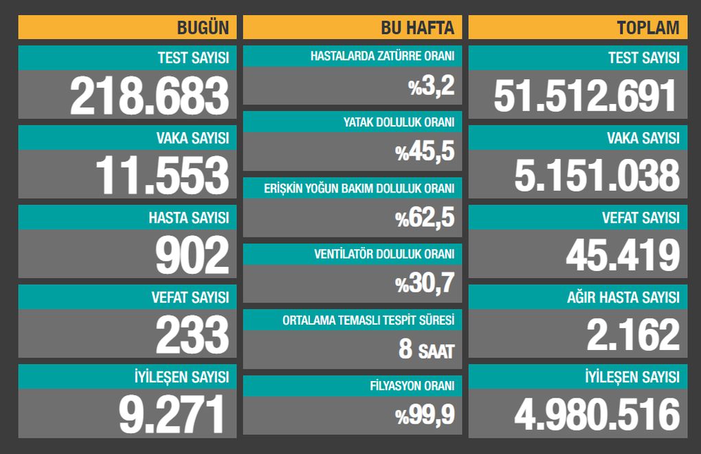 Sağlık Bakanlığı son 24 saatte 218.683 test yapıldığını, 11.553 kişiye Covid-19 tanısı konduğunu, 902 kişinin “hasta” kabul edildiğini, 233 kişinin de Covid-19 nedeniyle öldüğünü açıkladı.