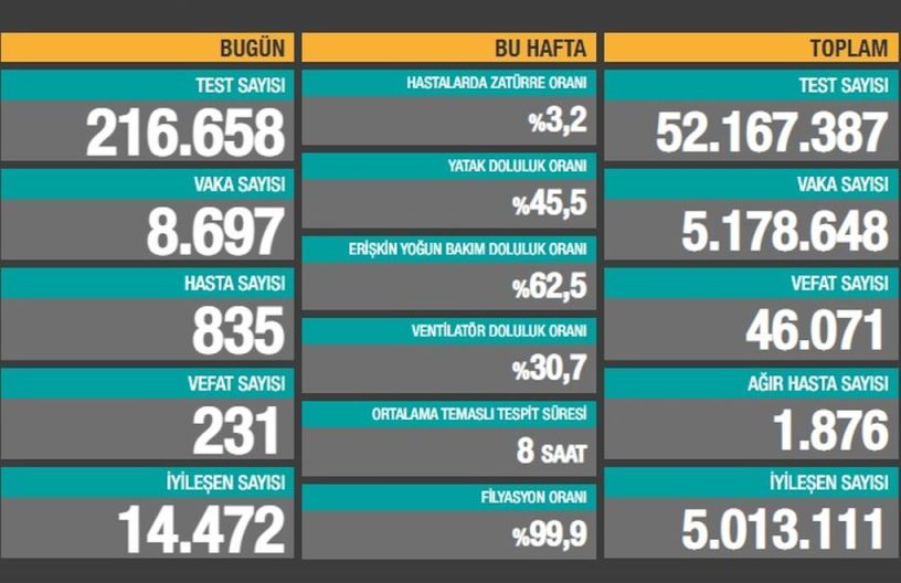 Türkiye’de son 24 saatte 216 bin 658 COVID-19 testi yapıldı, 8 bin 697 kişinin testi pozitif çıktı, bunlardan 835 kişi Covid-19 hastası kabul edildi. 231 kişi hayatını kaybetti.