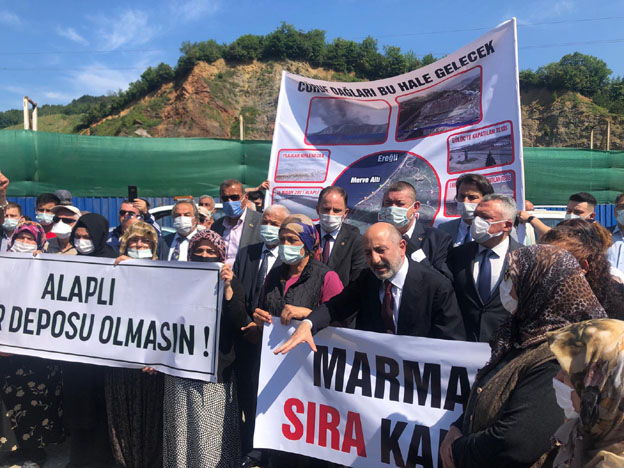 Ellerinde, “Marmara bitti sıra Karadeniz’de”, “Alaplı zehir deposu olmasın”, “Zonguldak ve 30 büyükşehir Alaplı’ya 39 zehir” yazılı dövizler bulunan kalabalığın içinde özellikle kadınların son derece tepkili olduğu gözlendi. Kadınlar yalnızca buraya değil hiçbir yere böyle tesisler istemediklerini yüksek sesle dile getirirken Alaplı Çevre Platformu Üyesi Mustafa Toroğlu yapılmak istenen proje, proje alanı ve çevredeki köyler hakkında bilgi verdi.