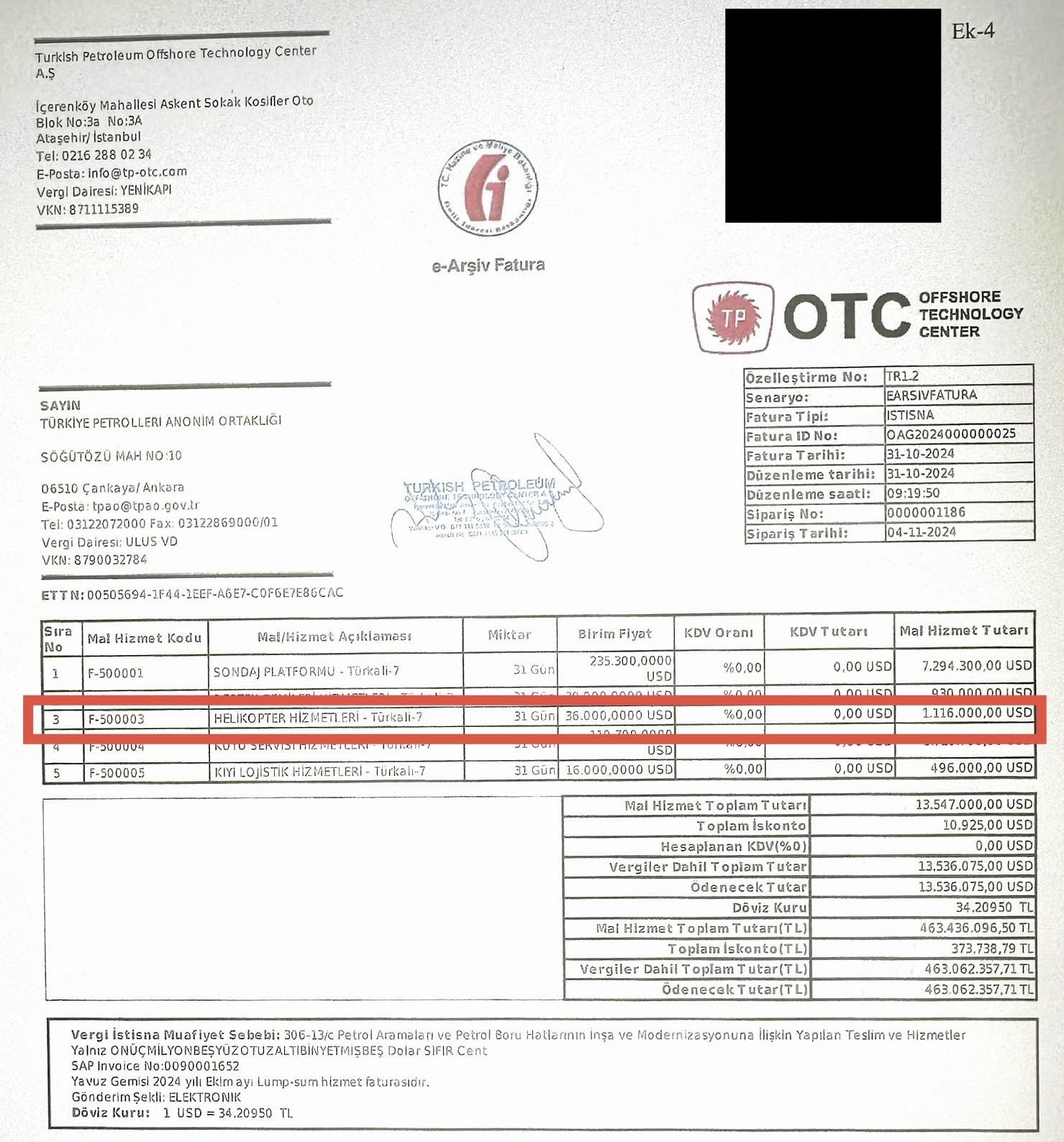 “Türkiye Petrolleri AŞ’nin alt şirketi olan Türkiye Petrolleri Offshore AŞ’nin sondaj gemilerine alınan helikopter hizmetleri için, Katar ortaklı bir helikopter kiralama şirketine yaptığı devasa tutardaki ödemeleri tespit ettik. TP-OTC önce kiralama tutarlarını TPAO’dan tahsil ediyor, ardından Redstar şirketine aktarıyor.